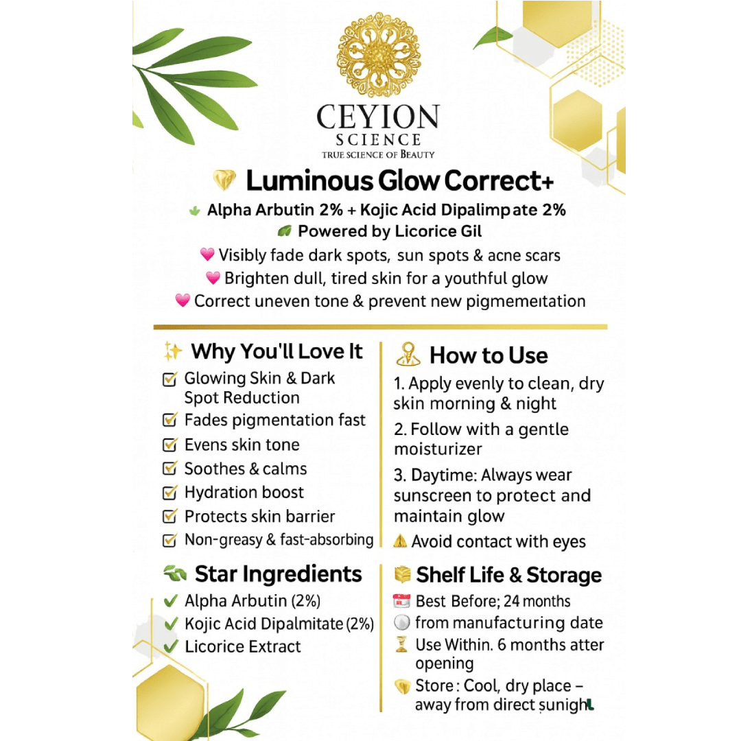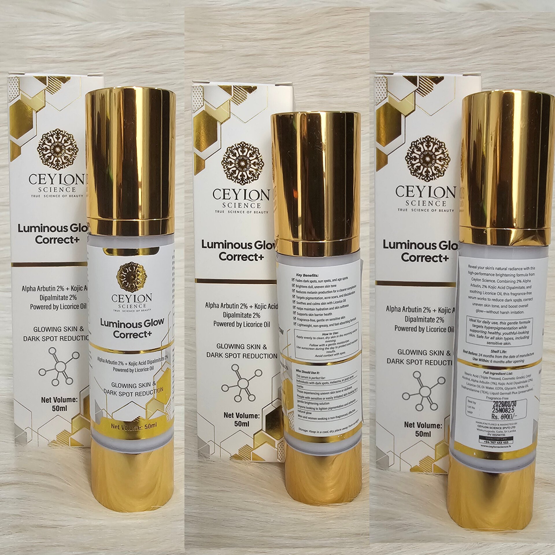 Your journey to radiance begins here. Ceylon Science Luminous Glow Correct+ is a powerful brightening serum that combines: